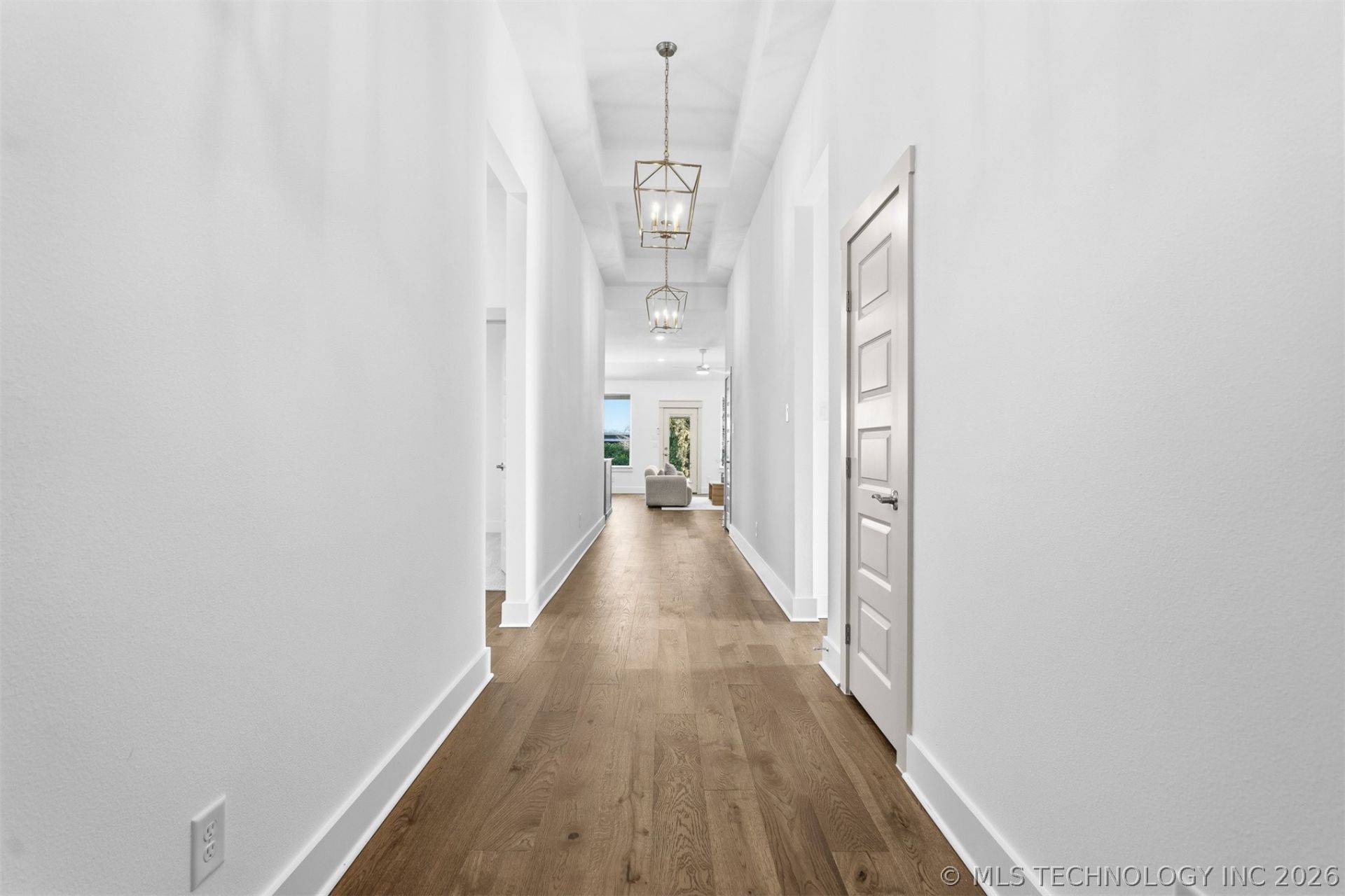 Beautiful new construction home on 1 acre mol just north of Thackerville, offering a peaceful setting with easy access to I-35 and close proximity to Winstar Casino. This 4-bedroom, 2-bath home with a 2-car garage features an open-concept layout ideal for everyday living and entertaining. A long, elegant entry hallway creates an immediate sense of luxury upon entry. The living room features an electric fireplace with a shiplap accent wall, while the kitchen offers quartz countertops, stainless steel appliances, custom cabinetry, and a large quartz island with seating-perfect for gathering and casual dining. The spacious dining area flows seamlessly with the main living space. Bedrooms are carpeted for comfort, while the primary suite showcases white oak engineered hardwood flooring and abundant natural light. The spa-like en suite bathroom includes a standalone soaking tub and walk-in tile shower. Each bathroom features its own distinctive tile design, adding a custom touch throughout. Additional features include gold-accented hardware, foam insulation, ample storage, full brick exterior, concrete driveway, sprinkler system, covered front porch, and a covered back patio with a wood-burning fireplace-perfect for relaxing or entertaining year-round.
