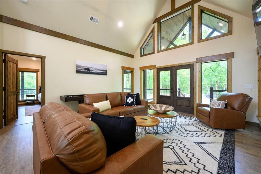 Located on a 1.27 acre lot in Southern Sunrise Phase 1, this newly constructed home offers 2 bedrooms and 2 bathrooms in one of the most centrally located developments in the area. The property sits on a large, usable lot with a running creek along the back.The home features high ceilings, large windows for natural light, and a well-finished interior with granite countertops and custom cabinetry. Build quality is solid throughout, designed for long term durability and use.Outside, a wraparound deck provides space for seating and outdoor living, including a hot tub, fire pit, and a covered outdoor seating area with a fireplace and mounted TV.The location is a major advantage, just minutes from Broken Bow Lake, Mountain Fork River, Beaver's Bend State Park, Choctaw Landing Casino, and the dining, shopping, and entertainment options in Hochatown and Broken Bow.